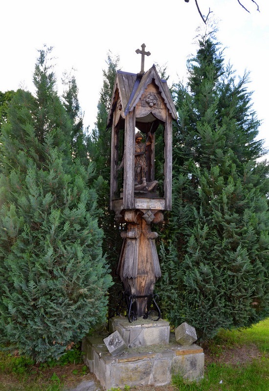Drewniana kapliczka stoi na placu przed drewnianym kościołem p.w. Wszystkich Świętych. Ustawiona jest na pięknym drewnianym postumencie umieszczonym na podstawie murowanej z kamieni. Ludowa drewniana figura św. Michała Archanioła znajduje się wewnątrz otwartej kapliczki, której łamany daszek zwieńczony krzyżem wsparty jest na czterech podporach. Figura przedstawia św. Michała Archanioła z lancą stojącego na diable. Kapliczka otoczona jest tujami.