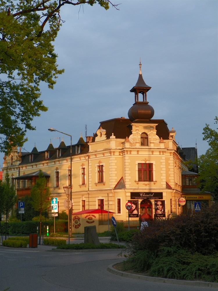 Obecny budynek zbudowany jest na planie litery “U”. Pochodzi z początków XX wieku a przekryty został dachami wielopołaciowymi. Naroże budynku ozdabia wykusz zdobiony boniowaniem, zakończony ścianką szczytową zwieńczoną niedużym baniastym hełmem, na którym osadzono daszek z iglicą. W narożach elewacji bocznych tworzących rozwidlenie skrzydeł widoczne są lekko wystające ryzality zwieńczone prostokątnymi ściankami kolankowymi, na których oparto wystające lukarny z dachu półmansardowego. Prawa elewacja boczna ( naprzeciw Sądu Rejonowego) została przedłużona o niewielką bryłę przekrytą dachami dwupołaciowymi, a dodatkowo pod okapem, w części jednego z nich - poddasza ozdobiono łukiem drewnianym spotykanym także w części konstrukcyjnej dachu pałacyku myśliwskiego w Promnicach.