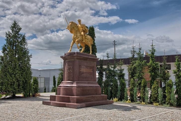 12 września 1939 roku 11 Pułk Ułanów Legionowych zwyciężył wojska niemieckie i wyzwolił miasto. Pomnik jest wykonany z pozłacanego brązu i osadzony jest na cokole obłożonym płytami z czerwonego granitu. Projektantem był Robert Sobociński. Wysokość pomnika wynosi 8 metrów a waga 30 ton.