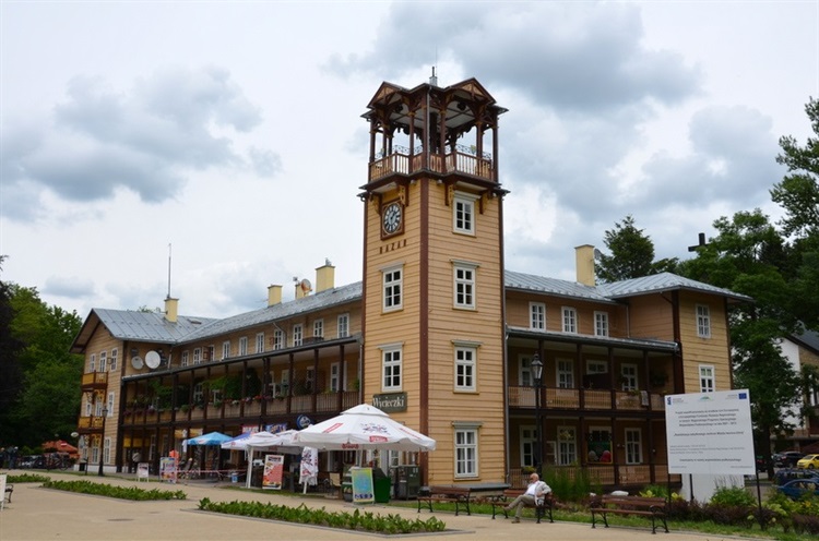 W narożniku południowo zachodnim wzniesiona zestala na rzucie kwadratu trzypiętrowa wieża z widoczną dużą, okrągłą tarczą zegarową i tarasem widokowym nakrytym wielospadkowym dachem. "Bazar" pierwotnie stanowił luksusowy hotel dla gości uzdrowiska, obecnie mieszczą się w nim lokale handlowe oraz mieszkania dla pracowników uzdrowiska.