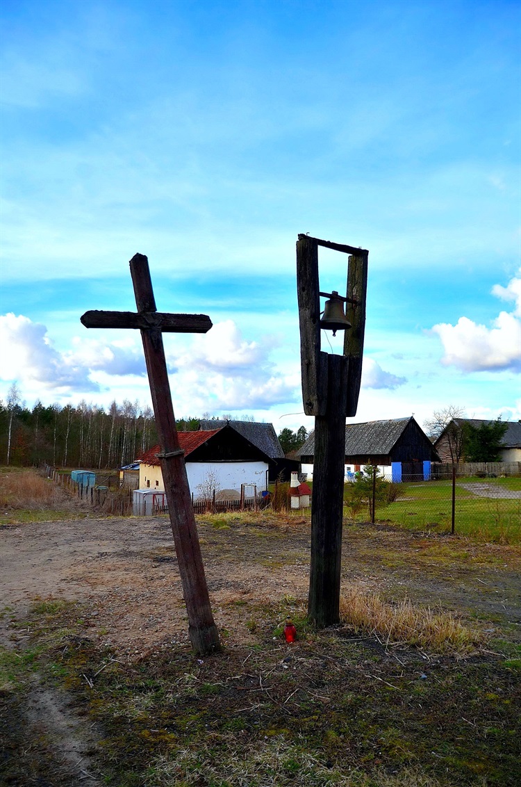 Z pewnością kiedyś dzwonniczka była zwieńczona daszkiem okapowym, dziś nosi tylko ślady jego bytności. Obok niej stoi przydrożny krzyż, również prosty w swej budowie z drobnymi ciesielskimi ozdobami. Na krzyżu można jeszcze dostrzec niewielką figurkę Chrystusa, dawniej podobnie jak dzwonniczka również osłoniętą blaszanym łukowym daszkiem okapowym.