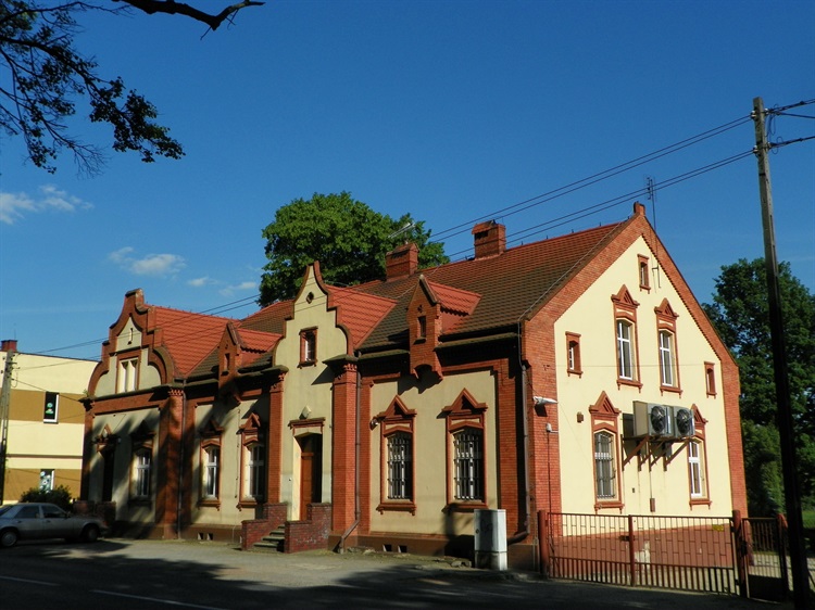 Elewację główną (od ulicy) wyróżniają 2 ryzality wejściowe, podtrzymujące jedną z dwóch ścianek szczytowych, zakończone opływami przypominające trochę styl barokowy, a także lukarny wykonane w cegle, nieotynkowane, nawiązujące nieco do zamkowych wykuszów. W otworach okiennych osadzono prostą stolarkę okienną o czterech polach. Wokół otworów okiennych widoczne są opaski okienne, podtrzymujące naczółki w kształcie trójkątnych daszków.