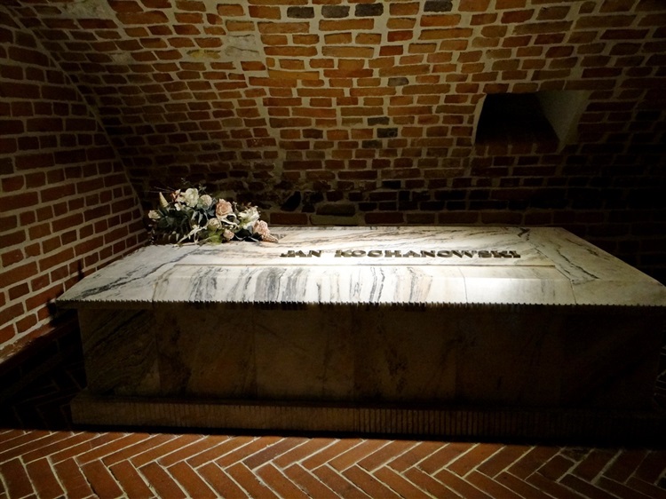 Pod posadzką znajduje się krypta z marmurowym sarkofagiem Jana i jego rodziny. W ścianę wmurowano starą mosiężną płytę z inskrypcją „A jeśli komu droga otwarta do nieba, tym, co służą ojczyźnie. W roku 1983 złożyliśmy tutaj prochy poety Jana i rodziny Kochanowskich. Polacy”. Treść inskrypcji wydaje się zaskakująca, dlatego przed wizytą w kościele warto najpierw udać się do ulokowanego w starej plebanii Centrum Regionalnego. Tam dowiedzieć się można wielu ciekawostek – m.in. o wędrówce szczątków Kochanowskich oraz o zaginionej czaszce samego Jana.