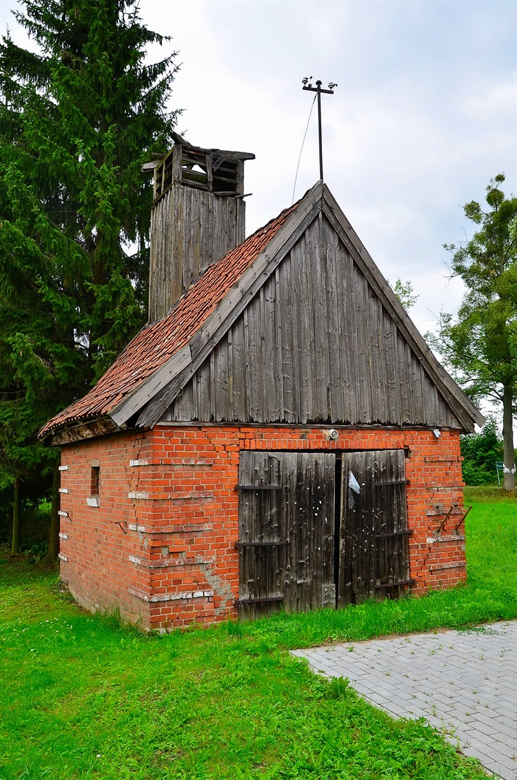 Natomiast w centrum tego miejsca, w rozwidleniu dróg, dodatkowo natrafimy na nieczynną już i niestety podniszczoną, dawną remizę Ochotniczej Straży Pożarnej. Na zwisającej metalowej chorągiewce wiatrowej widnieje data 1930, można więc przypuszczać, iż jest to data wzniesienia budowli. W kronikach dawnych Straży Pożarnych, na terenie Prus Wschodnich, nie ma wzmianki, aby do 1925 roku istniała taka sekcja w Łomach. Można więc przyjąć, iż data na wspomnianej chorągiewce jest też datą powstania tej jednostki.