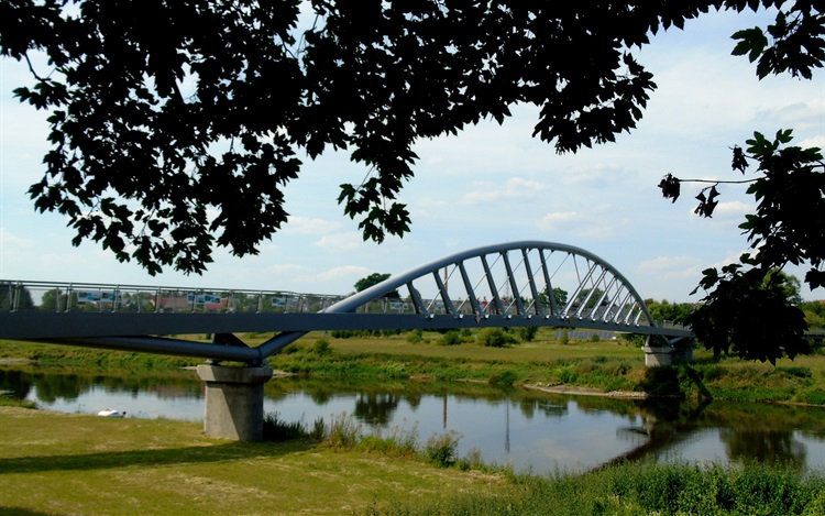 Kładka ma długość ponad 206 metrów, z czego 90 przypada na część nurtową, a reszta biegnie nad terenem zalewowym. W miejscu ich połączenia usytuowany jest taras widokowy. Całości dopełnia infrastruktura z miejscami odpoczynku i odpowiednio dobranym oświetleniem.