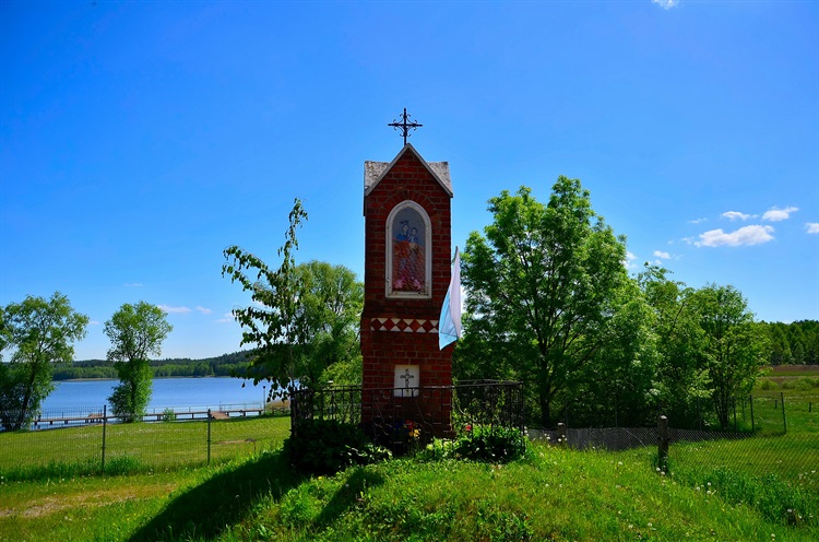 Kapliczka usytuowana przy wjeździe do wsi stoi na wzniesieniu, otoczona pięknie kutym ogrodzeniem. To dwukondygnacyjna prosta bryła, z ciekawymi geometrycznymi wzorami oddzielającymi jej części. Zdobi ją duża przeszklona wnęka z figurą Matki Boskiej z Dzieciątkiem, oraz kuty krzyż na szczycie.
