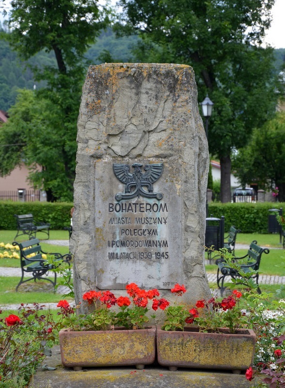 Na skwerku nieopodal kapliczki św. Jana Nepomucena usytuowany jest pomnik poświęcony poległym mieszkańcom podczas II wojny światowej. Tablica pamiątkowa umieszczona na bloku skalnym zawiera wizerunek orła oraz napis o treści "BOHATEROM MIASTA MUSZYNY POLEGŁYM I POMORDOWANYM W LATACH 1939 – 1945". Pomnik został odsłonięty 22 lipca 1957 roku.