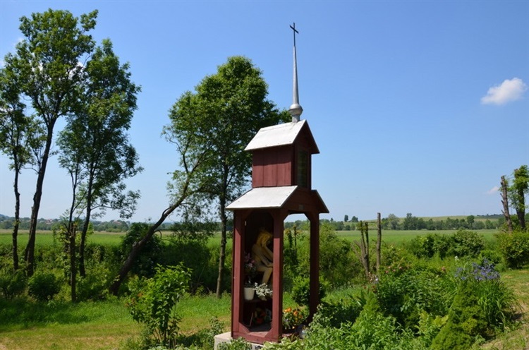 Kapliczka ufundowana i wykonana została przez Jana Kazeckiego. Jest to kapliczka drewniana, dwuczęściowa, nakryta dwuspadowym daszkiem zwieńczonym metalową kulą, na której na metalowej podstawie umieszczony został krzyż. W dolnej części kapliczki, w otwartej z trzech stron wnęce znajduje się ludowa rzeźba przedstawiająca Chrystusa Frasobliwego, natomiast w górnej części kapliczki zabezpieczonej szklanymi drzwiczkami umieszczona została ludowa figurka Matki Boskiej. Kapliczka poświęcona została 20.05.2015.