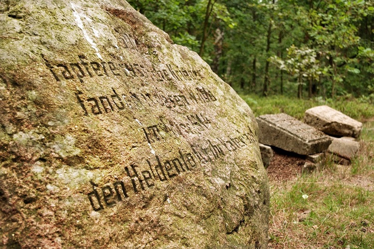 Na tej niewielkiej nekropolii, znajduje się głaz upamiętniający 500 żołnierzy rosyjskich z niemieckojęzyczną inskrypcją. Jest on centralnym obiektem na cmentarzu. Napis głosi "500 odważnych rosyjskich żołnierzy, poległych w tym lesie, w listopadzie 1914, bohaterską śmiercią za swoją ojczyznę". Oprócz niego w tym miejscu, znajdują się także, kamienny pomnik upamiętniający żołnierzy Armii Niemieckiej i Armii Rosyjskiej z 1914 r., mogiły żołnierzy Wojska Polskiego, poległych w 1939 r., kapliczka Matki Boskiej oraz pomnik pamięci żołnierzy WP z 1939 r.