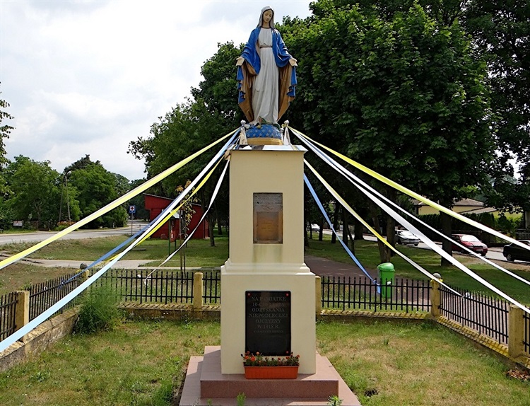 Ustawiony na skwerze dokładnie naprzeciwko wejścia do kościoła pomnik, na pierwszy rzut oka przypomina przydrożną kapliczkę. Otoczony płotkiem dwustopniowy cokół wieńczy figura stojącej na globie i depczącej węża Najświętszej Panienki. U jej stóp umieszczono dwie tablice – większa informuje o intencji: „Na pamiątkę 10-cio lecia odzyskania niepodległej ojczyzny w 1918 r. parafianie Brzózy”. Mniejsza oddaje honor i wspomina poległych mieszkańców pobliskich miejscowości: „Padli na polu chwały odpierając z granic państwa polskiego pod wodzą Józefa Piłsudskiego nawałę najeźdźców w latach 1918 – 20 Jan Drapała z Adamowa, Piotr Kwiatkowski z Wólki Brzózkiej i Andrzej Skwira z Marianowa”.