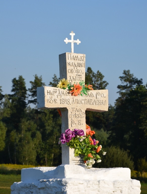 Krzyż ten niczym zapisane stronice książki zarówno od frontu, jak i z tyłu pokryty jest wykutym tekstem w języku ukraińskimi i wypełnionym czarnym barwnikiem. Treść napisu po przetłumaczeniu – od frontu "Niech wam będzie prawowierny krzyż, pamięć wieczna danej swobody zbaw Panie lud Twój, pobłogosław dziedzictwo Twoje zwycięstwem prawowiernego króla naszego nad wrogami obdarzaj" oraz z tyłu "Pamięci nadanej swobody od pańszczyzny od dnia 15 maja roku bożego 1848, a postawiona ta figura roku bożego 1850 miesiąca maja dnia 18".