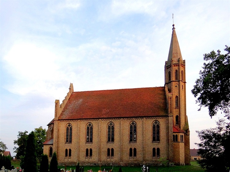 Wewnątrz tej dwupiętrowej budowli nad nawami bocznymi usytuowano drewniane empory, a wyżej na drugim piętrze umieszczone są organy. Świątynia zbudowana z żółtej cegły imponuje wielkością i widoczna jest z dużej odległości od Głuchowa.