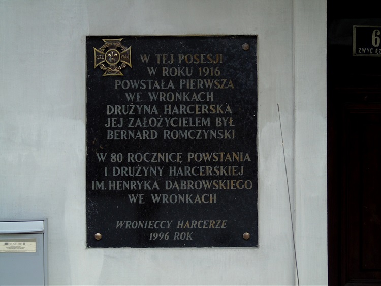 Powstanie pierwszej drużyny harcerskiej we Wronkach upamiętniono okolicznościową tablicą, która w 1996 r. zawisła na ścianie domu, gdzie odbywały się pierwsze zbiórki. Na tablicy tej znalazł się napis o treści: „W tej posesji w roku 1916 powstała pierwsza we Wronkach drużyna harcerska. Jej założycielem był Bernard Romczyński. W 80 rocznicę powstania I Drużyna Harcerskiej im. Henryka Dąbrowskiego we Wronkach. Wronieccy harcerze 1996”.