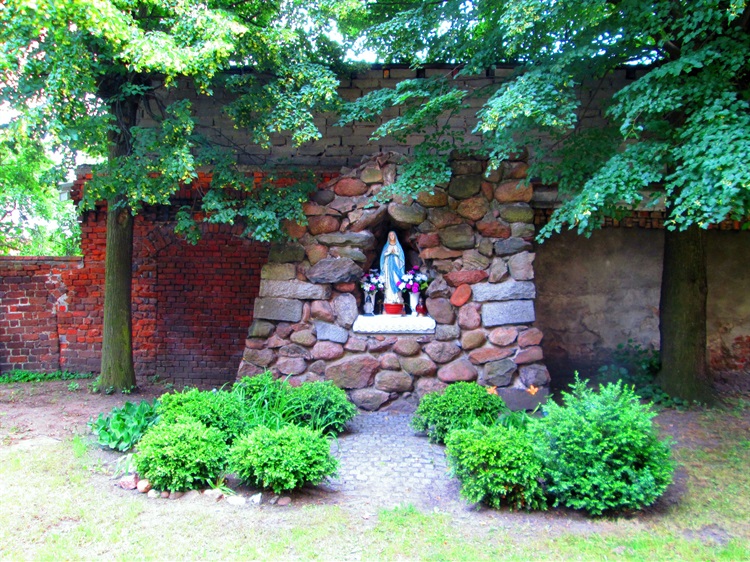 Przy kościele p.w. św. Jakuba znajduje się grota z figurą Matki Boskiej. Zbudowana jest z bloków oraz kamieni polnych. Figura Matki Boskiej w biało-niebieskiej szacie umieszczona jest we wnęce.