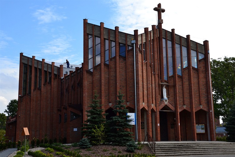 Figuralne przedstawienie portugalskiego Objawienia z 1917 r. ustawiono z tyłu kościoła przy elewacji wschodniej w pobliżu wkomponowanej w budowlę plebanii.