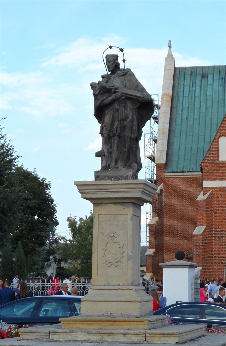 Figura św. Jana Nepomucena znajduje się na palcu przed kościołem. Figura znajduje się na cokole, który jest ozdobiony herbem „Janosza”. Została ufundowana przez Ludwikę Szaniawską w 1788 r.