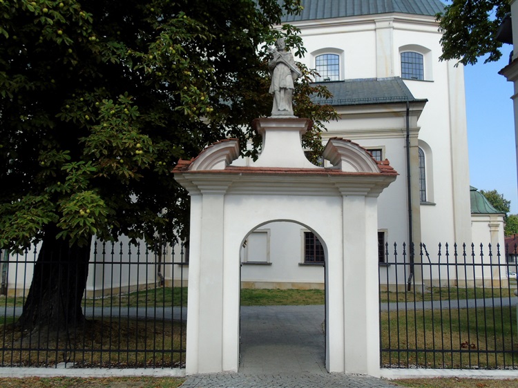 W mieście od 1737 r. do początkowych lat XIX wieku działało Bractwo Nepomuckie skupiające duchownych oraz mieszkańców Ziemi Łowickiej. Z istnieniem Bractwa wiąże się fundację bramy prowadzącej na teren katedry. Prowadząca do świątyni od południa brama, zbudowana w drugiej połowie XVIII wieku, została ozdobiona kamienną rzeźbą św. Jana Nepomucena. Święty obrany jest w tradycyjne szaty oraz biret na głowie oraz trzyma na ręku krzyż.