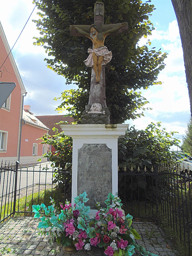 Niegosławice, do 1945 r. noszące niemiecką nazwę Waltersdorf, to głównie rolnicza wieś w powiecie żagańskim. Jej główną atrakcją jest zespół kościoła św. Anny. Pomiędzy wspomnianym zespołem i Urzędem Gminy stoi inna pamiątka z przeszłości. Jest to kamienny, rzeźbiony krzyż z ukrzyżowanym Chrystusem. Obiekt pochodzi prawdopodobnie z XIX wieku. Na jego cokole widnieje niestety mało czytelny napis. Niedawno odnowioną kapliczkę otacza kuty, metalowy płotek.