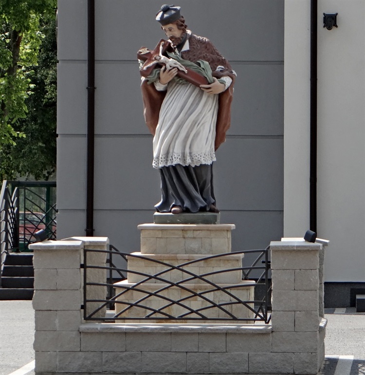 Wyjątkowej urody barokowa figura św. Jana Nepomucena stoi w centrum wsi, przy skrzyżowaniu ulic Puławskiej i Żuławy. Nietrudno ją znaleźć – za plecami świętego znajduje się restauracja „Nepomucen” a naprzeciwko –chluba miejscowości, czyli wspaniały, manierystyczny kościół p.w. Św. Floriana i Św. Katarzyny oraz Domek Loretański.