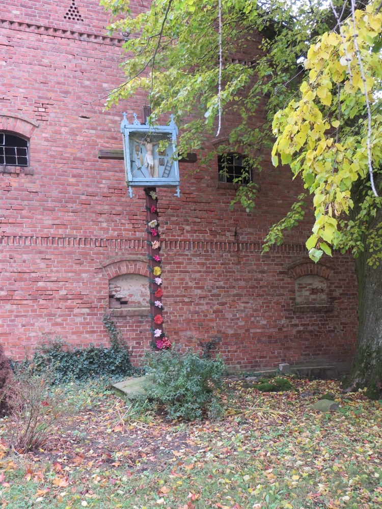 Kilkanaście lat później na skutek działań atmosferycznych krzyż zawalił się, został odnowiony, a dwa lata później powrócił na swoje miejsce. W zachowanej ozdobnej skrzyni znajdują się wykonana z drewna - rzeźba Chrystusa oraz emblematy: młotek, veraikon, drabina, srebrniki itd... ułożone są na desce w prostej kompozycji. W okresie wiosenno - letnim ciężko jest dostrzec wśród zieleni to ludowe dzieło sztuki. Ale dla chcącego nic trudnego...
