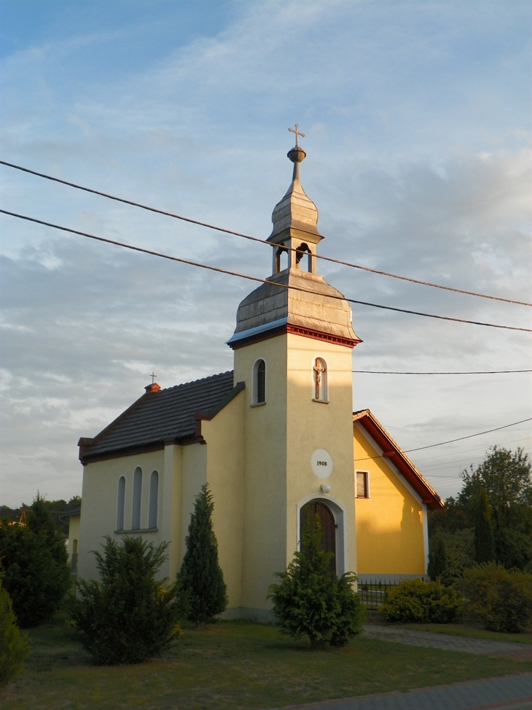Kaplica zbudowana jest na planie zbliżonym do prostokąta, z dzwonnicą na planie kwadratuod frontu, przez którą wchodzi się do wnętrza “małej świątyni”. Jej korpus został przekryty dwupołaciowym dachem pokrytym współczesną dachówką ceramiczną typu karpiówka. Bryła kaplicy została otynkowana tynkiem koloru zbliżonego do żółtego odcienia, co doskonale współgra ze światłem słoecznym, kiedy pada ono na centrum wsi, oświetlając kaplicę. Nawet, jeśli jest już słabe pod koniec dnia czy w okresie jesienno-zimowym, to i tak podkreśla swymi promieniami obecność kaplicy we wsi od ponad 100 lat.