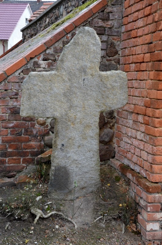 Krzyż pokutny stoi przy ceglanym murze zewnętrznym, przed wejściem bocznym na teren kościoła p.w. św. Michała Archanioła. Zgodnie ze średniowiecznym prawem został wykuty z miejscowego surowca (w tym przypadku w granicie) przez mordercę, któremu za popełnioną zbrodnię darowano życie. Oprócz krzyża morderca był zobowiązany między innymi do: pokrycia kosztów pogrzebu ofiary, dostarczenia kościołowi określonej ilości wosku, zamówienia mszy świętej, odbycia pielgrzymki do miejsca świętego, a jeśli był stanu wolnego musiał ożenić się z żoną ofiary. Przy krzyżu tym zwanym również krzyżem pojednania rodzina wyrzekała się zemsty.
