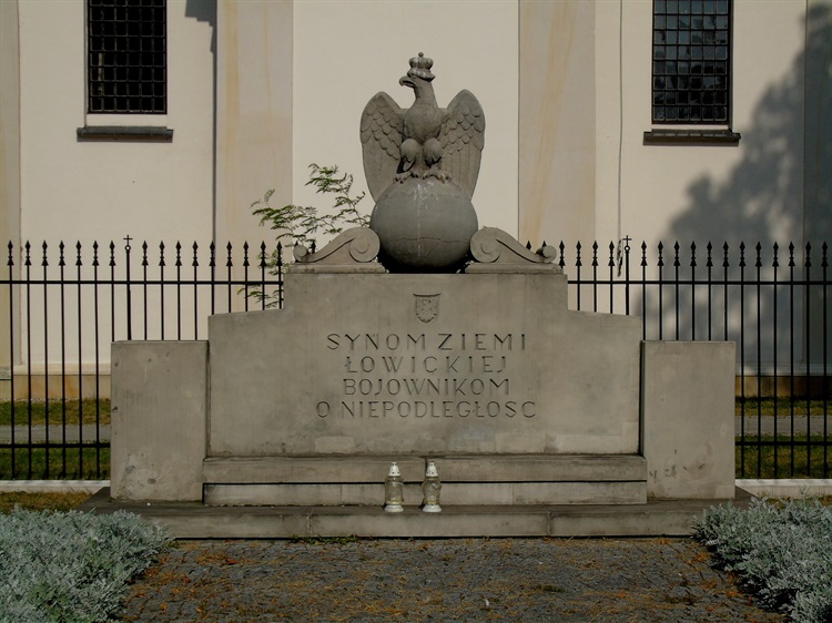 Na Starym Rynku w Łowiczu, przy murze otaczającym bazylikę katedralną stoi Pomnik Synom Ziemi Łowickiej Bojownikom o Niepodległość. Pomnik powstał w 1927 r. dla upamiętnienia żołnierzy poległych w walkach o niepodległą Polskę. Powstał z inicjatywy społecznej, a pracami nad jego realizacją czuwał powołany komitet. Obelisk zaprojektował znany wówczas architekt Stanisław Noakowski. Obiekt z charakterystycznym białym orłem na kuli został zniszczony przez Niemców w 1941 r., a jego pozostałości rozebrano w 1945 r. Pomnik doczekał się rekonstrukcji w 1986 r. i dziś stanowi miejsce uroczystości związanych z rocznicami odzyskania niepodległości.