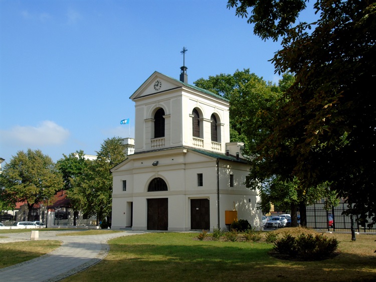 Klasycystyczną dzwonnicę zbudowano w 1786 r. podczas przebudowy ówczesnej kolegiaty. Autorem jej projektu był doskonały architekt tamtych czasów Szymon Bogumił Zug. Dwukondygnacyjna dzwonnica zwieńczona jest trójkątnym tympanonem z zegarem. Szczyt dachu ozdobiła niewielka sygnaturka z krzyżem.