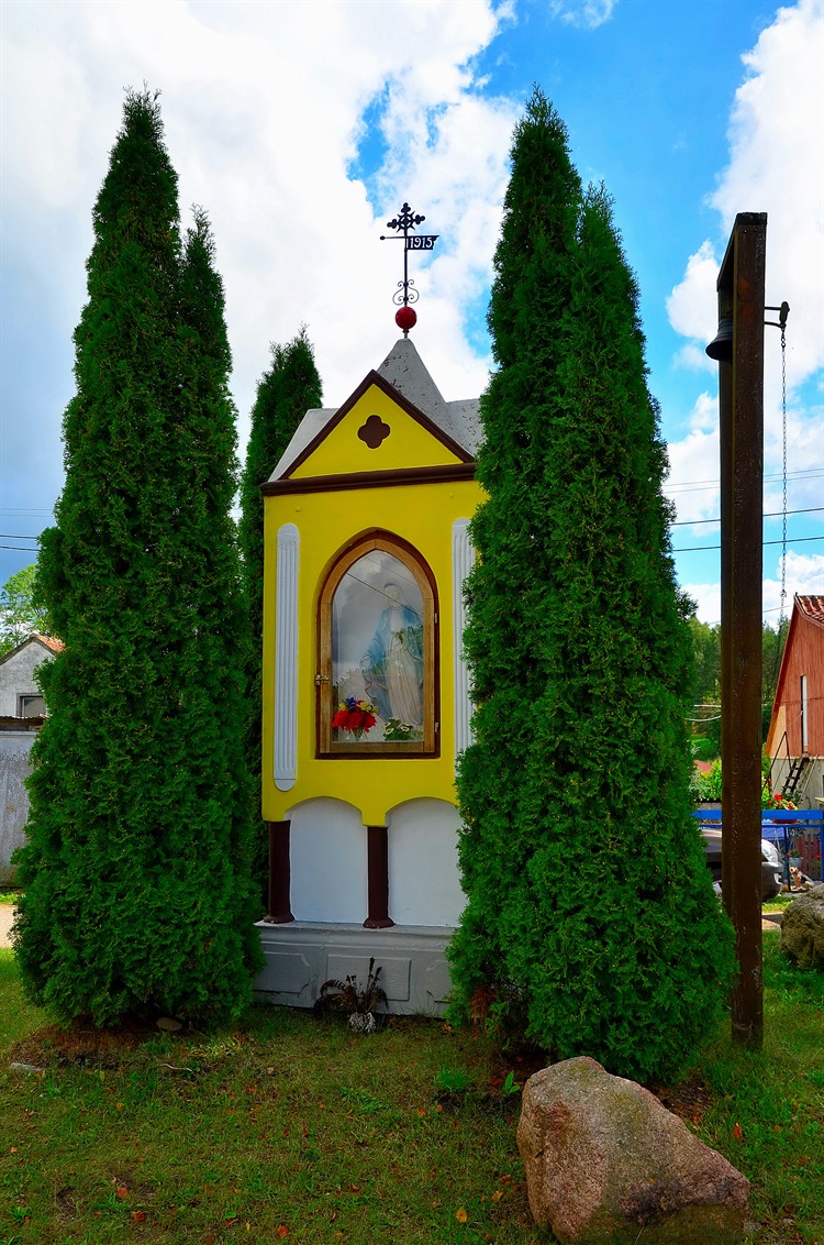 W samym centrum na skrzyżowaniu dróg znajduje się interesująca kapliczka wybudowana w 1915, o czym informuje chorągiewka na dachu. Ta budowla należy do kiedyś bardzo powszechnych, a obecnie rzadko spotykanych przykładów łączenia murowanej kapliczki z osobną, zazwyczaj drewnianą dzwonniczką. Obecnie dzwonniczka to nowa konstrukcja z zachowanym starym dzwonkiem.