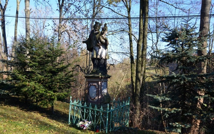 Na brzegu nieopodal mostu nad potokiem Roszycki Spław znajduje się barokowa polichromowana figura przedstawiająca św. Jana Nepomucena. Postać wieńczy ozdobny cokół ustawiony na kamiennej podstawie. Frontową ścianę cokołu wyróżnia otok, w którym wyryty jest fundacyjny napis w języku niemieckim "IOHANES VONNEPOMUCKBIT FUR UNS. BEI GOTT A: 1801 VON. DER. GEMEINDE ZUR EHRE GOTTES UND.EWIGEN ANDENKEN. ER RICHT.ET WORDEN" (JANIE NEPOMUCENIE MÓDL SIĘ ZA NAMI U BOGA. W ROKU 1801 POSTAWIONY PRZEZ GMINĘ NA CHWAŁĘ BOGA I WIECZNĄ PAMIĄTKĘ ). Na bocznych ścianach cokołu widnieją sceny biblijne. Kamienna rzeźba umieszczona na sokole przedstawia św. Jana w kontrapoście, ubranego w strój kapłański, głową nakrytą biretem i aureolą z pięcioma gwiazdami. Głowa zwrócona jest w kierunku krzyża trzymanego w lewej ręce na gałązce palmy. U stóp figury umieszczone zostały ozdobne metalowe uchwyty na światełka.