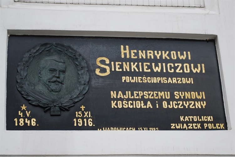 Na tablicy widnieje podobizna pisarza oraz data 15 XI 1925 roku. Tablica znajduje się na frontowej ścianie Bazyliki Ofiarowania Najświętszej Maryi Panny przy pl. Jana Pawła II 1.