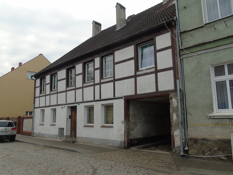 Przy ulicy Henryka Sienkiewicza prowadzącej od Kościoła Mariackiego do Baszty Prochowej (Więziennej) znajduje się pochodząca z XIX wieku ryglowa kamienica. Piętrowy budynek posiada widoczną konstrukcję drewnianą na poziomie piętra wypełnioną otynkowaną i bieloną cegłą. Dom jest zabytkiem o znaczeniu lokalnym.