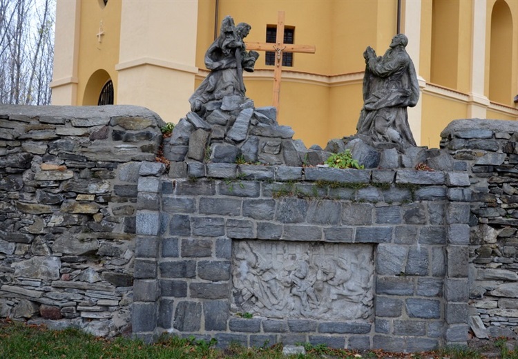 Na zewnętrznym fragmencie muru otaczającego teren kościoła św.św. Szymona i Tadeusza umieszczona jest XVIII - wieczna scena biblijna z ogrodu oliwnego, w którym Jezus Chrystus wraz z apostołami przebywał na czuwaniu modlitewnym. Zawiera ona w płycinie kamiennego muru płaskorzeźbę apostołów śpiących w Ogrójcu. Powyżej płaskorzeźby na murze znajdują się dwie kamienne figury. Pierwsza przedstawia pogrążonego w modlitwie Chrystusa zwracającego się do Boga w postaci anioła ( druga postać na murze) podającego Synowi Bożemu kielich goryczy.