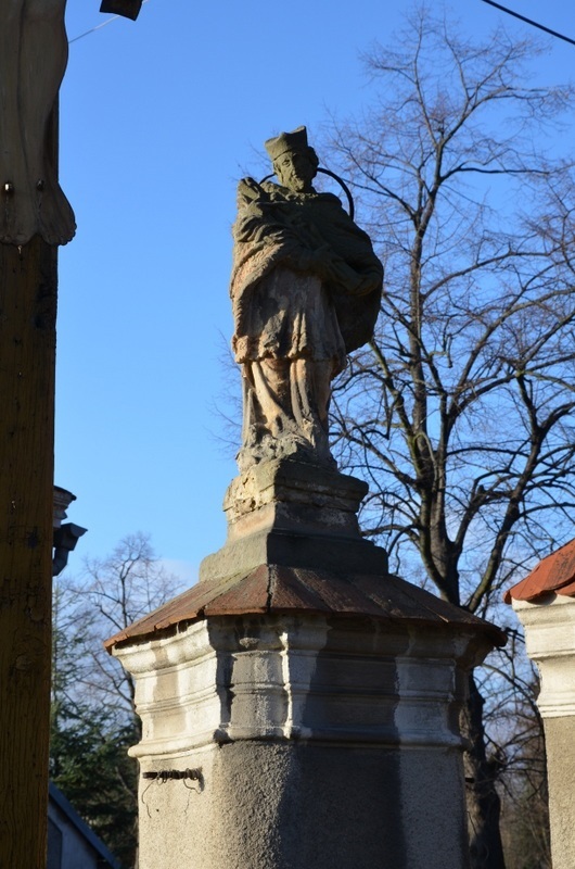 Kamienna, barokowa figura świętego stoi na wysokim postumencie będącym częścią kamiennego muru otaczającego teren kościoła, przy bramie wschodniej wzniesionej w 1753 r. W tym samym roku powstała również rzeźba św. Jana Nepomucena. Postać św. Jana stoi na prostokątnej podstawie ustawionej na gzymsie postumentu. Rzeźba wykonana z piaskowca przedstawia świętego w kontrapoście, z krzyżem leżącym na gałązce palmy, na prawym ramieniu oraz z uszkodzoną aureolą.