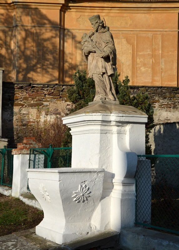 Pierwsza rzeźba stoi przed wejściem na teren kościoła przy plebanii. Figura wieńczy duży ładny postument z ołtarzykiem ozdobionym motywami roślinnymi przyległym do jego ściany frontowej. Postać św. Jana ubrana jest w tradycyjne szaty, z krzyżem na prawym ramieniu i głową z uszkodzoną aureolą skierowaną w jego kierunku.