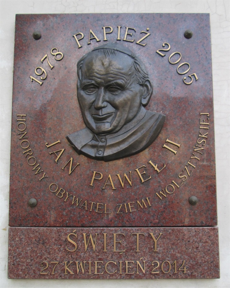 W Wolsztynie, na murze kościoła p.w. Niepokalanego Poczęcia NMP znajduje się tablica upamiętniająca Jana Pawła II. Znajduje się na niej podobizna Ojca Świętego. Z tablicy dowiadujemy się, że papież jest Honorowym Obywatelem Ziemi Wolsztyńskiej. Są tam również daty pontyfikatu 1978-2005 oraz data 27 kwietnia 2014, kiedy Jan Paweł II ogłoszony został świętym.