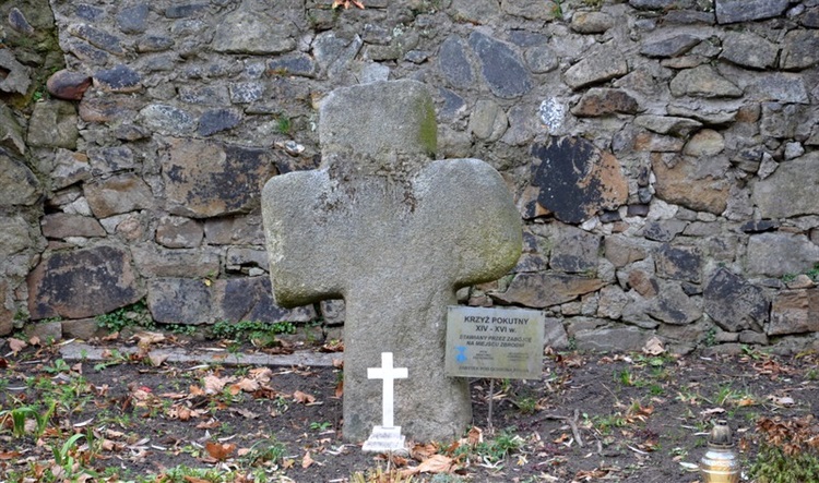 Na terenie kościoła św. Jana Ewangelisty, przy średniowiecznym kamiennym murze wkopany jest średniowieczny krzyż pokutny. Krzyż wykonany jest z piaskowca przez winowajcę w ramach pokuty za popełnioną zbrodnię. Jego wymiary to 100 cm wysokości i 70 cm szerokości. Na ramionach krzyża wyryte są rysy miecza lub sztyletu – prawdopodobnego narzędzia zbrodni.