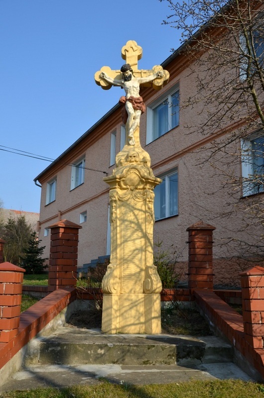 Na głowicy umieszczony jest kamienny krzyż z figurą ukrzyżowanego Chrystusa i czaszką Adama u jego podnóża. Ramiona krzyża zakończone są w strzałkę. Szczyt krzyża z pionowym wygiętym kartuszem INRI również zakończony jest w strzałkę. Według wierzeń chrześcijan, krew wypływająca z przebitego boku Chrystusa spływa do czaszki Adama, oczyszczając z grzechu pierworodnego całą ludzkość.