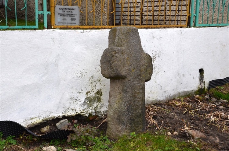 Kamienny krzyż wkopany jest przed ogrodzeniem prywatnej posesji. Przy krzyżu, na ścianie ogrodzenia umieszczona jest stosowna tabliczka o treści „Krzyż pokutny XIV – XVI w. Stawiany przez zabójcę na miejscu zbrodni”. Nie oznacza to jednak, że jest to krzyż pokutny, ponieważ nie wiadomo czy z tym krzyżem związana jest umowa kompozycyjna. Umowa, która jest zawarta pomiędzy zabójcą a rodziną ofiary. Jeżeli tak, to jest to krzyż pokutny zwany również krzyżem pojednania. Jeżeli nie, to może to być np. krzyż wotywny, nagrobny lub inny.