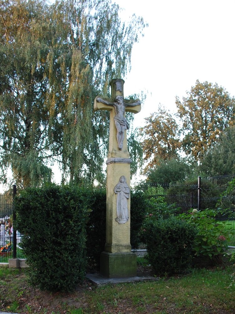 Jak można wnioskować ze słabo czytelnych inskrypcji, krzyż najprawdopodobniej pochodzi z 1777 roku, a jego fundatorem był Georg Mahe. Krzyż znajduje się na ul. Legionów, przy ogrodzeniu cmentarza parafii NMP Wspomożenia Wiernych.