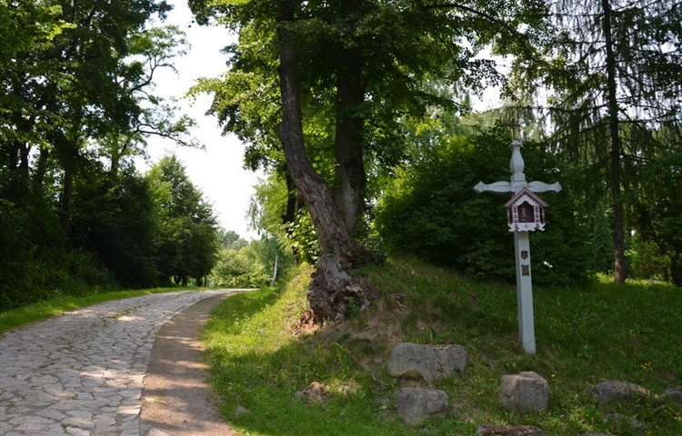 W parku dworskim, na skraju drogi dojazdowej do XIX wiecznego dworku stoi ładny drewniany krzyż z małym metalowym krzyżykiem na jego szczycie. Centralne miejsce krzyża zajmuje piękna drewniana kapliczka skrzynkowa z figurką Chrystusa Frasobliwego.