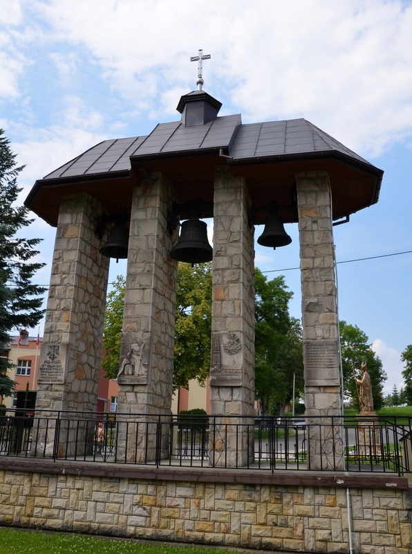 Ściany dzwonnicy wzniesione są na planie prostokąta i murowane z kamienia. Na każdej ścianie od strony kościoła wmurowane są cztery tablice. Trzy kamienne tablice zawierają płaskorzeźby i treść nawiązującą do historii Polski.