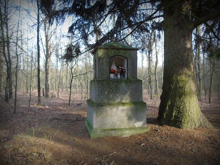 Murowana, otynkowana kapliczka wnękowa stoi przy imponującym świerku. W jej wnęce stoją współczesna figurka Matki Boskiej oraz sztuczne kwiaty. Kapliczkę wieńczy brogowy daszek z krzyżem.