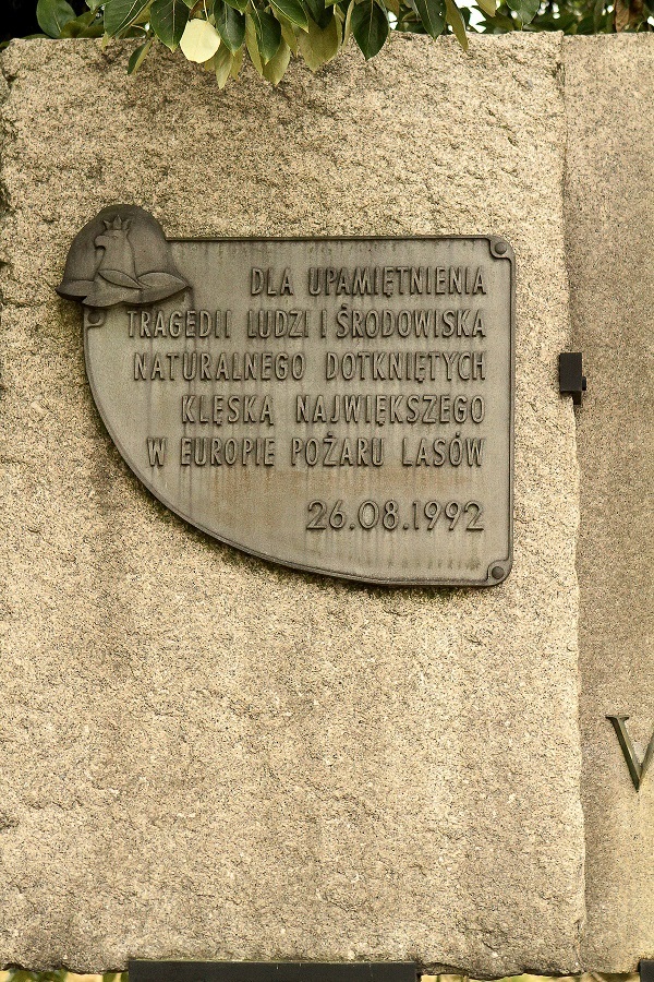 Na jednej z płyt Pomnika Zwycięstwa widnieje tablica upamiętniająca wielki pożar lasu który wybuchł 26 sierpnia 1992 roku. Na tablicy widnieje napis: "Dla upamiętnienia tragedii ludzi i środowiska naturalnego dotkniętych klęską największego w Europie pożaru lasów". Przyczyną pożaru najprawdopodobniej była iskra spadająca spod kół hamującego pociągu. Pożar lasu był największym, jaki miał miejsce w Polsce oraz Europie po II wojnie światowej.