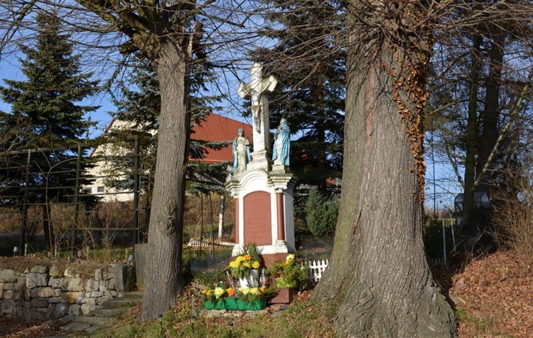 Pomiędzy drzewami, na skraju wiejskiej drogi we wsi Wolany usytuowana jest grupa figuralna Boża Męka. Składa się z wysokiego ozdobnego cokołu z rozbudowanym gzymsem, na którym posadowiony jest krzyż. Po obu stronach krzyża, u jego podnóża stoją dwie figury. Frontowa ściana cokołu zawiera płycinę z inskrypcją. Centralną postacią Bożej Męki jest ukrzyżowany Jezus Chrystus. Chrystus na głowie ma nałożoną koronę cierniową i widoczną ranę w prawym boku. Nad głową poziomy kartusz z inicjałami INRI. Stojące pod krzyżem postacie to: Matka Boża przedstawiona w formie tzw. Matki Boskiej Bolesnej ze splecionymi dłońmi i wzrokiem skierowanym na ukrzyżowaną postać Chrystusa oraz zapewne św. Jan Ewangelista.