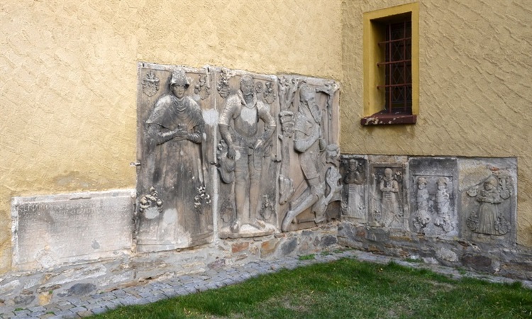 W zewnętrznych murach kościoła Matki Bożej Królowej Świata i św. Marcina wzniesionego w 1668 r. wmurowanych jest siedem renesansowych płyt nagrobnych. Na kamiennych płytach znajdują się kartusze herbowe oraz płaskorzeźby trzech osób dorosłych i cztery płyty z płaskorzeźbami dzieci.