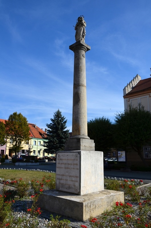 Zwężająca się ku górze kolumna pod głowicą ozdobiona jest czterema ośmiopłatkowymi rozetkami. Na szczycie kolumny stoi figura Matki Bożej. Maria na lewej ręce trzyma dzieciątko Jezus a w opuszczonej prawej ręce berło. Nad głową Matki Bożej umieszczona jest gwiezdna aureola.