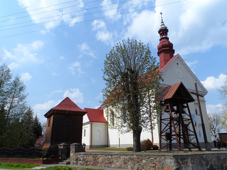 We wnętrzu świątyni znajduje się ołtarz główny z pierwszej połowy XVII w., pochodzący z Wąchocka. Do najcenniejszych zabytków kościoła należą: dwa obrazy flamandzkie z XVII w., późnogotycka figura Jezusa Chrystusa, krucyfiks z XVIII w. Przy kościele znajduje się drewniana dzwonnica, która została wzniesiona w 1893 r.
