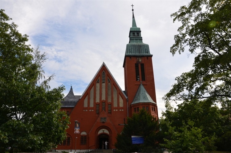 Kościół zbudowany jest z cegły w kształcie zachowanym do dzisiaj, łączy cechy stylu neoromańskiego wewnątrz i stylu neogotyckiego na zewnątrz. Obiekt jest długi na 37 m, szeroki na 23 m a wysokość wieży wynosi 42 m. Po 1945 r. kościół został zamknięty. W latach 1962 – 1982 urządzony był w nim magazyn po czym przejęty został przez katolików.