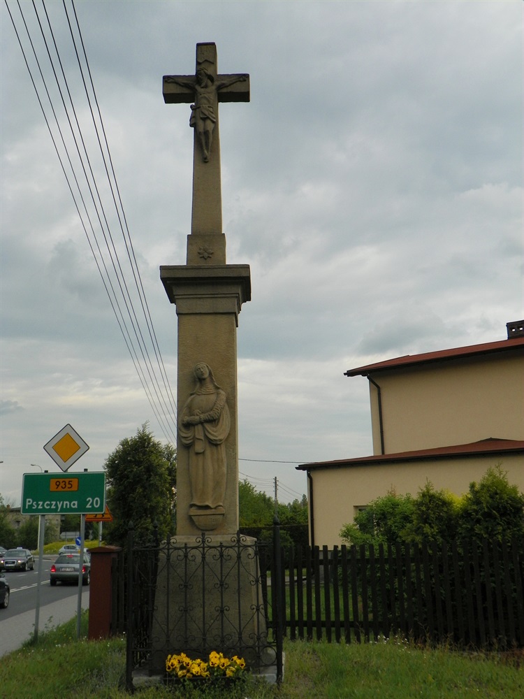 Jadąc z Żor w stronę Pszczyny ulicą Nowopszczyńską będącą jednocześnie drogą wojewódzką (DW 935) relacji Żory-Pszczyna, parę metrów przed rondem, na niewysokim pagórku stoi kamienny krzyż. Z wyrytej na postumencie daty wynika, iż został postawiony w 1840 roku przez Petera Zapkę. Niestety, napis jest już tak wytarty, że za datę postawienia krzyża można również uważać rok 1870. A jeśli ta druga data byłby bliższa prawdzie, to może opowiadać o niej krążąca do chwili obecnej legenda o jednym z bogatych mieszkańców tejże okolicy o nazwisku Zapka, bądź Żabka - lubiącym kobiety ale nie zamierzającym żenić się z żadną, za co musiał w ramach pokuty (kiedy urodziło się jego dziecko) wystawić kapliczkę albo też postawić krzyż, chociaż mogą tu zachodzić pewne sprzeczności... ( jedna z kalpiczek pochodzi z 1903 roku i znajduje się w niewielkiej odległości od opisywanego krzyża ).